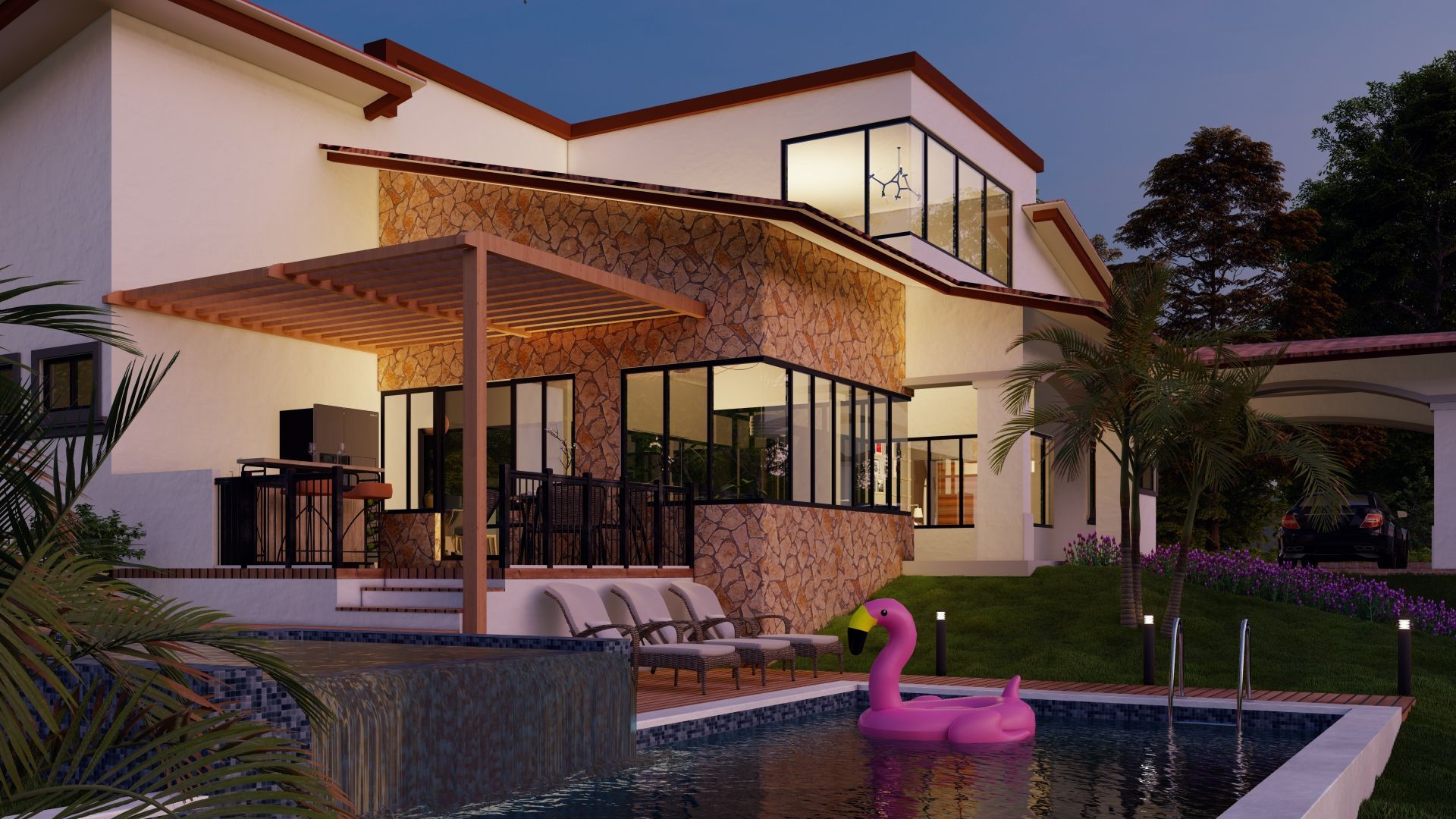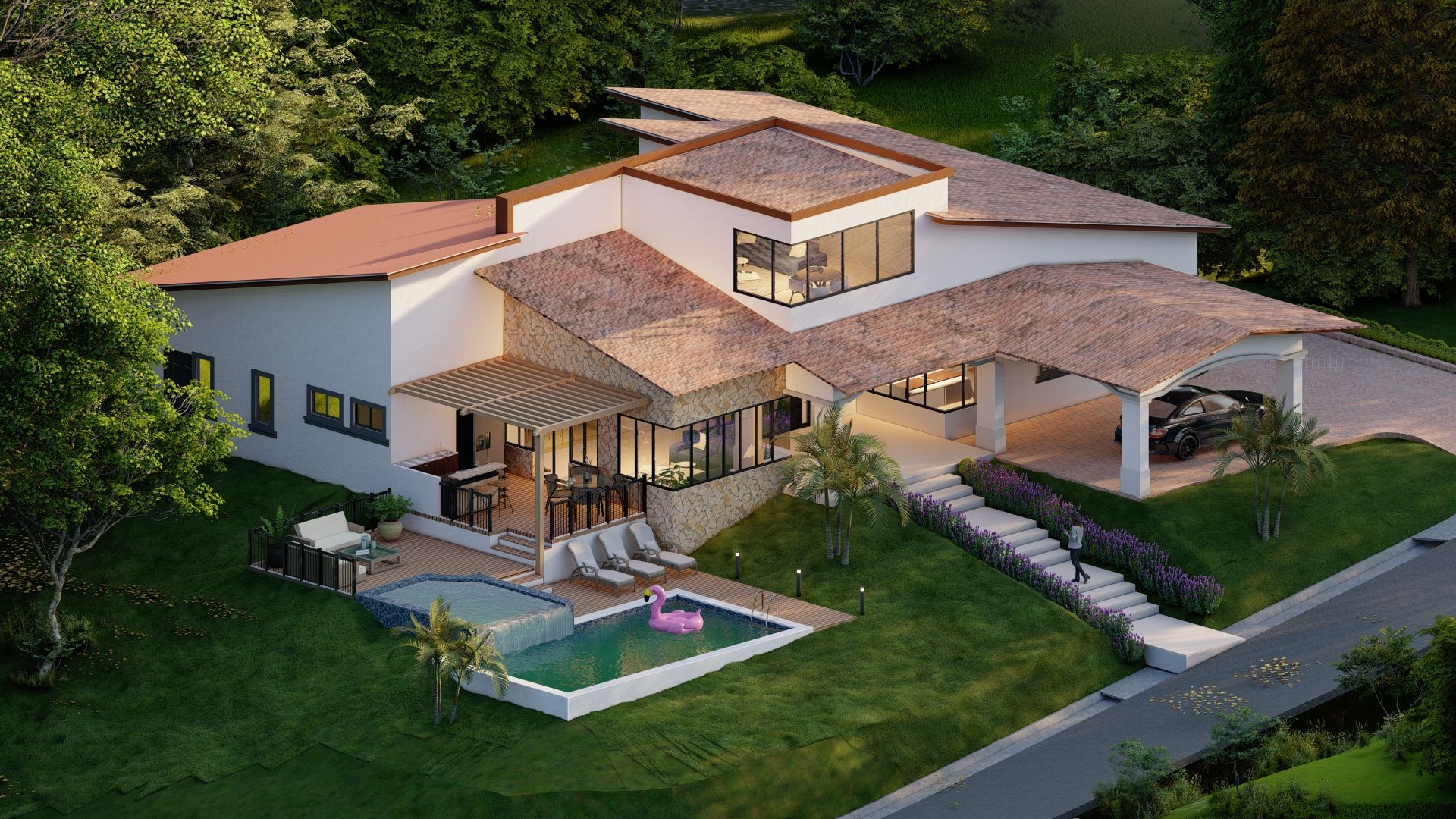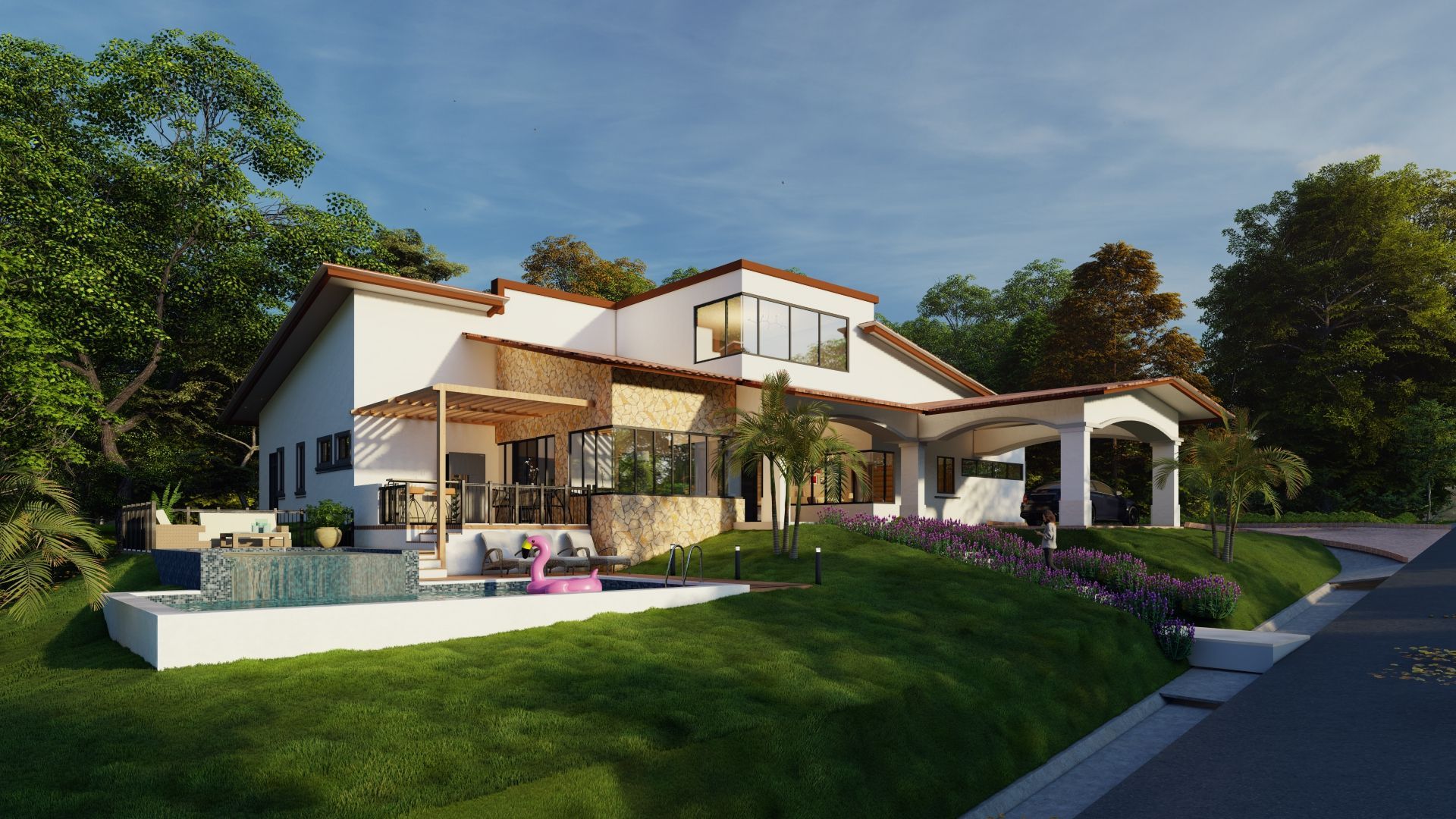 Este proyecto, ubicado en Brisas de los Lagos, Provincia de Panamá Oeste, consiste en el diseño de una vivienda de campo de lujo de dos niveles, combinando elegancia y confort en un entorno natural privilegiado. Su arquitectura se distingue por un juego de volúmenes a diferentes alturas, generando dinamismo y una estética imponente. La residencia cuenta con cubiertas de teja, que aportan un toque rústico y sofisticado, mientras que sus amplios ventanales permiten una conexión fluida con el paisaje. Como parte de sus espacios recreativos, incluye una piscina con cascada, creando un ambiente de relajación y exclusividad. Además, dispone de varias terrazas, diseñadas para disfrutar del aire libre y las vistas panorámicas, convirtiendo esta vivienda en un refugio ideal donde el lujo y la naturaleza se complementan perfectamente.