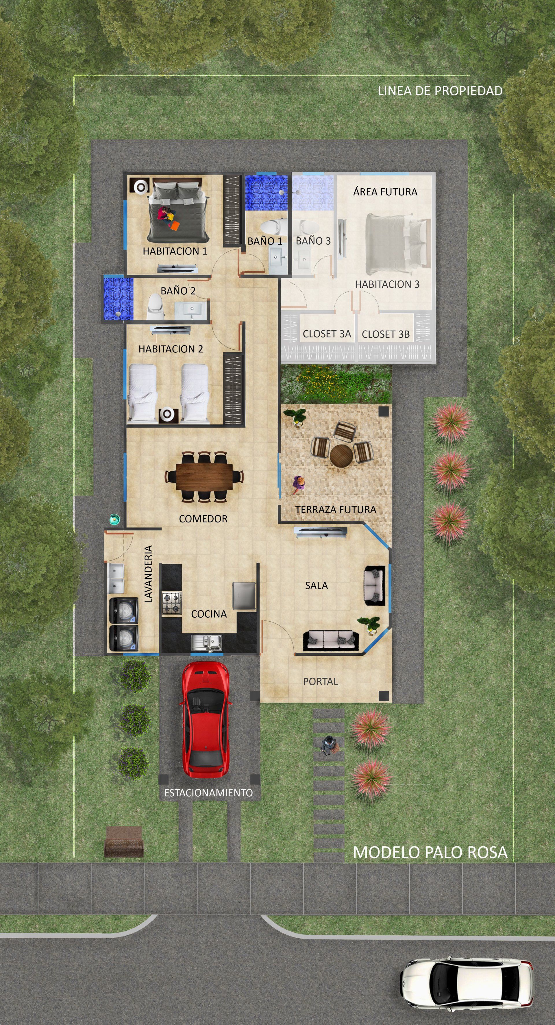 El modelo de vivienda Palo Rosa ubicado dentro del proyecto Residencial Terra de Montes cuanta con un área de terreno desde 300.00 m2 y un área de construcción de aproximadamente 106.09 m2. Contemplada por diferentes materiales con los más altos estándares de calidad como lo son: Techo de teja metálica, paredes de bloques, cielo raso de Gypsum en el interior de la vivienda, cielo raso de PVC en el interior de la vivienda, muebles de madera en cocina y closets, sobres de granito en la cocina, puerta de seguridad en exteriores, agua caliente, tuberías para futuras conexiones de paneles solares.