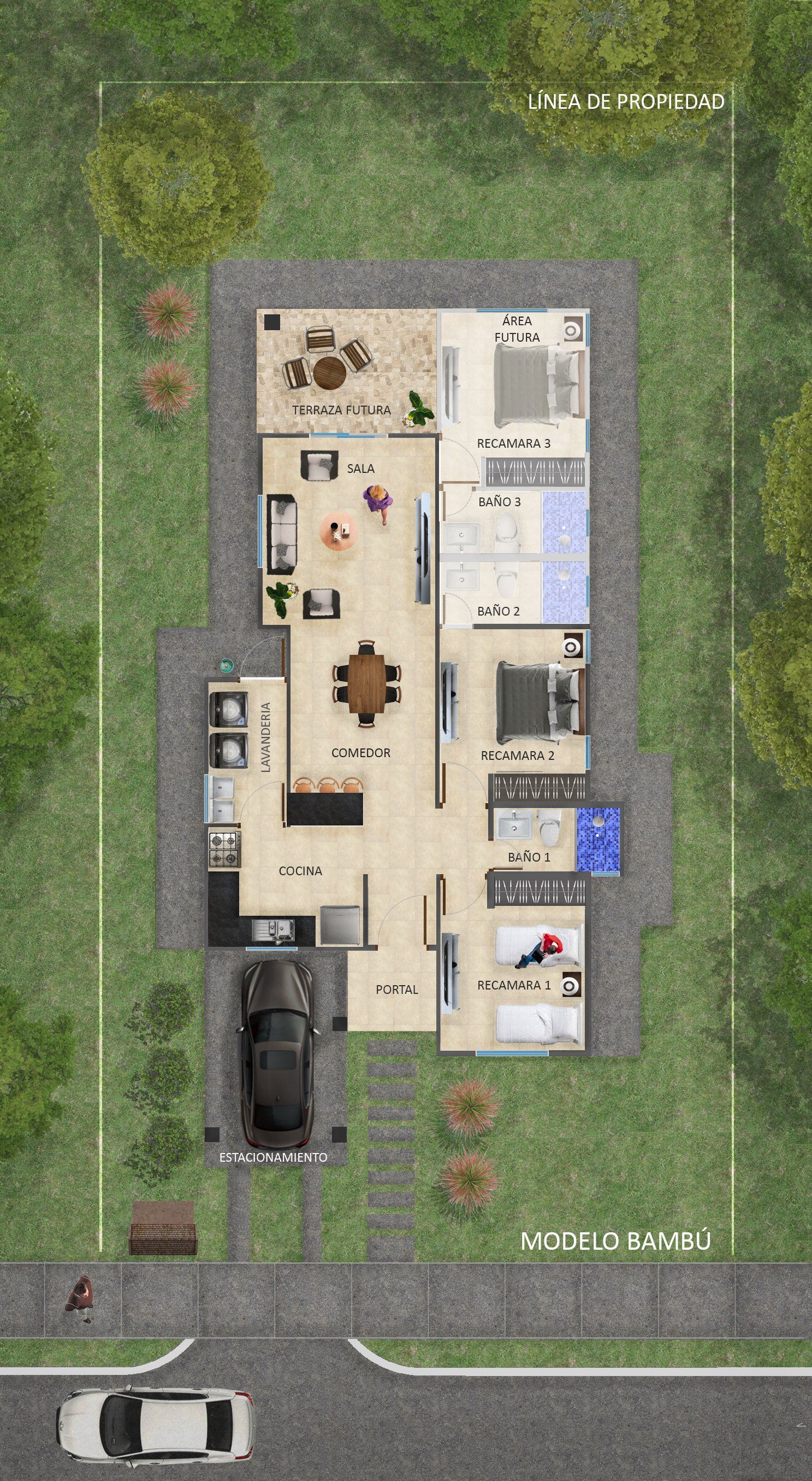 El modelo de vivienda Bambú ubicado dentro del proyecto Residencial Terra de Montes cuanta con un área de terreno desde 300.00 m2 y un área de construcción de aproximadamente 91.75 m2. Contemplada por diferentes materiales con los más altos estándares de calidad como lo son: Techo de teja metálica, paredes de bloques, cielo raso de Gypsum en el interior de la vivienda, cielo raso de PVC en el interior de la vivienda, muebles de madera en cocina y closets, sobres de granito en la cocina, puerta de seguridad en exteriores, agua caliente, tuberías para futuras conexiones de paneles solares.